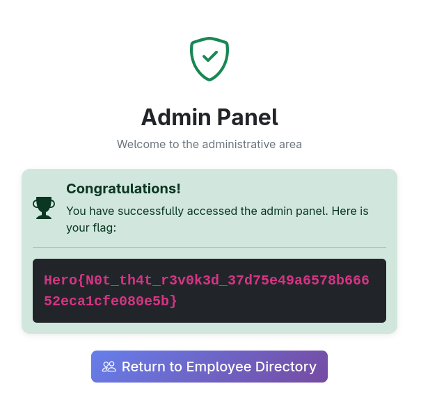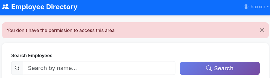 Logging in with our new user brings us into an employee directory with a search bar, and in the top right corner is a drop-down for the logged in user. Clicking our username reveals the option “Admin panel”, but clicking that returns “ You don’t have the permission to access this area”.